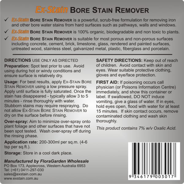 Ex-Stain Bore Iron Stain Cleaner is a powerful, scrub-free formulation for removing iron and other bore water stains from hard surfaces such as pathways, walls, and windows.